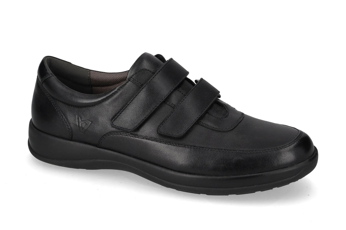 Scarpa Valleverde da uomo in pelle nera con chiusura a velcro, tomaia e sottopiede in pelle, comfort e praticità quotidiana.